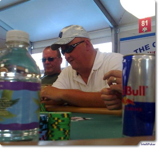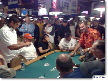My day yesterday started with a big mistake – going to the WSOP an hour before the event was scheduled to start. Katja had decided to skip this event so I went alone. They had just closed the doors to the main playing area and everybody was gathering in the floors. It got so full that nobody could move. I managed to spend 30 minutes in the massage area, getting a nice should and back massage. Togehter with my Bose noice canceling headset I was able to escape the crazyness for over 20 minutes. They opened the doors at noon exactly but it took annother hour before the tournament could actually start. After waiting 30 minutes on my table when it was announced they are starting later so I strolled around. My table was placed in the new paviloun section with about 80 tables where it was hot as the desert because the doors never got closed. While strolling I meet many friends and observed Mike "the mouth" Matusow and Sheiky Sheikaram (famous for their WSOP arguments) playing some chinese poker on a table with the tournament stacks in action.